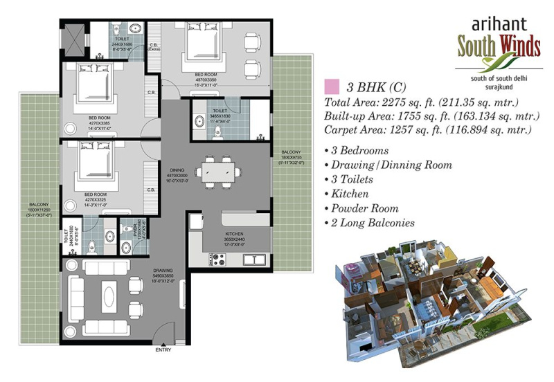 Arihant Southwinds is Luxury Apartment Project which is launched by famous real estate company Arihant Group. It is located in Sector 41 Surajkund, Faridabad. Arihant Southwinds speard in 1.7 acres. There is two types of Apartments available in the project - 3BHK & 4BHK. The Super area of apartments for 3BHK is between 2275 & 2685 sq ft. and for 4BHK is 3295 Sq.ft. All Apartments is carefully designed according to luxurious, modern lifestyle. The area of Arihant Southwinds has high rise residential tower. it is Located close to the two main metro stations, Sarai Metro station and N.H.P.C. Chowk Metro station Faridabad.\r\n\r\nAll amenities of Arihant Southwinds are designed to make residents\' lives easier and more enjoyable. For example, the 24/7 security ensures that residents feel safe and secure at all times. The elevators make it easy to get around the building, even if you have heavy luggage. The clubhouse is a great place to relax and socialize with other residents. The video doorphone allows you to see who is at the door before you open it, for added security. The Arihant Southwinds also promote a healthy and active lifestyle. It also include the swimming pool, the gymnasium, the cycling and jogging track, and the rainwater harvesting system. The swimming pool is a great way to stay cool and active in the summer. The gymnasium of Arihant Southwinds is a great place to get a workout in. The cycling and jogging track is a great way to get some exercise. The rainwater harvesting system helps to conserve water.\r\n\r\nHighlights\r\n1. False ceiling with LED lights\r\n2. Beautiful Wall Papers\r\n3. Italian Marble Flooring\r\n4. Wardrobes and Modular kitchen\r\n5. 10.5 Feet Floor to ceiling height\r\n6. Large Spacious Balconies Upto 48ft Long*\r\n7. Free AC in All Bedrooms.